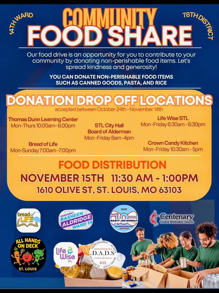 Our Community SHARE was launched in response to the federal government shutdown, which caused delays and gaps in SNAP benefits for many families. Spearheaded by State Rep Marty Murray of the 78th District — in partnership with St. Louis City Alderman Rasheen Aldridge and our home base, Centenary UMC — All Hands On Deck: STL, stepped in to make sure no one went without essentials. Together, we provided over 200 families with FREE fresh groceries & vital resources to help our neighbors stay supported during an uncertain time.