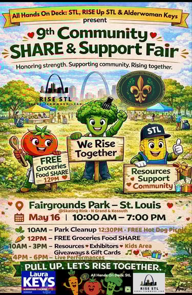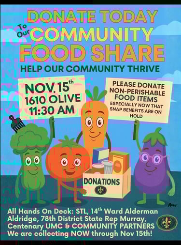 Our Community SHARE was launched in response to the federal government shutdown, which caused delays and gaps in SNAP benefits for many families. Spearheaded by State Rep Marty Murray of the 78th District — in partnership with St. Louis City Alderman Rasheen Aldridge and our home base, Centenary UMC — All Hands On Deck: STL, stepped in to make sure no one went without essentials. Together, we provided over 200 families with FREE fresh groceries & vital resources to help our neighbors stay supported during an uncertain time.