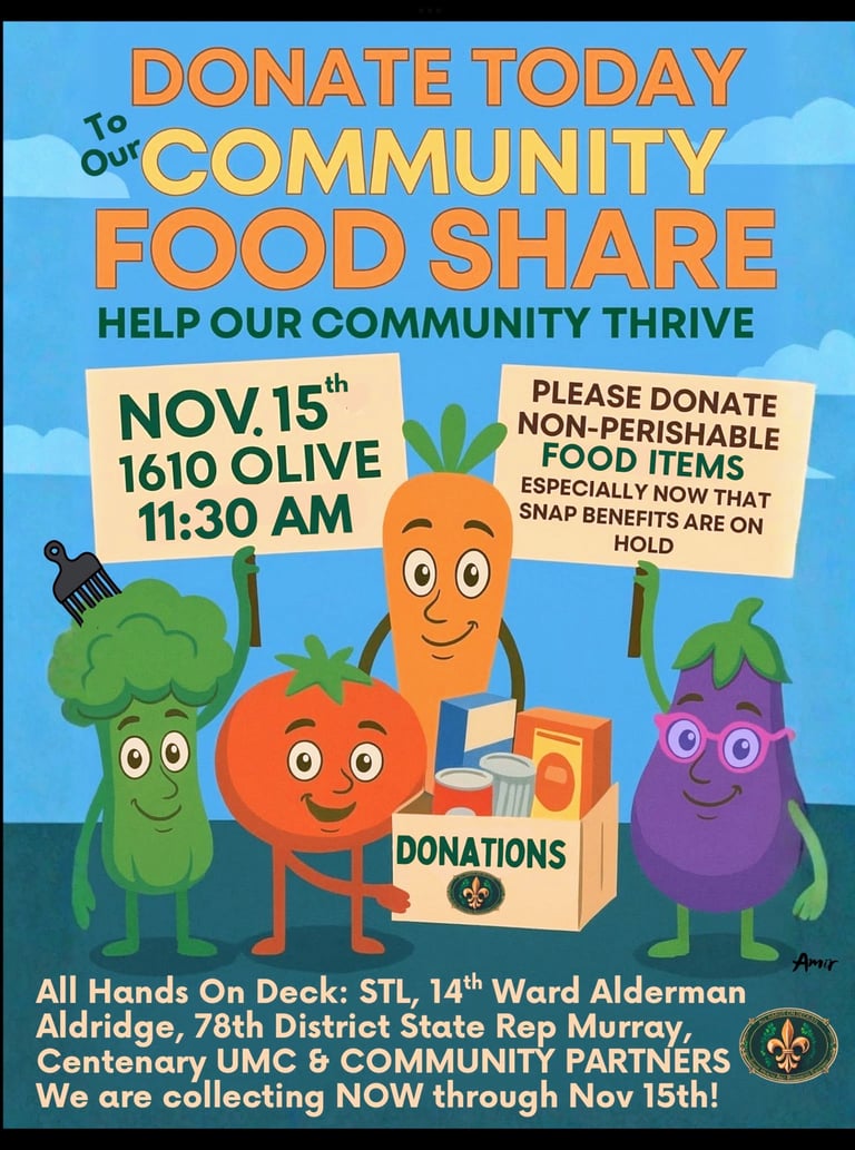 On November 15th, we hosted a powerful Community-Wide SHARE at 1610 Olive with State Representative Marty Murray and Centenary UMC to support families impacted by the SNAP benefit delay — and Elliot Davis TV came out to cover it LIVE. 🙌